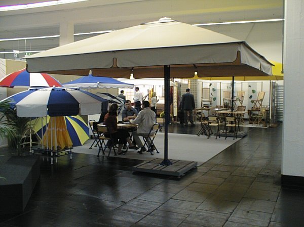 Конструкция зонта – телескопическая. Благодаря такой конструкции купол зонта складываясь, уходит вверх на 1,15 м, спицы зонта не опускаются ниже 1,7 м от земли и т.о. под сложенным зонтом остается свободное пространство для столов и посетителей, а также тент остается чистым в дождливую погоду.